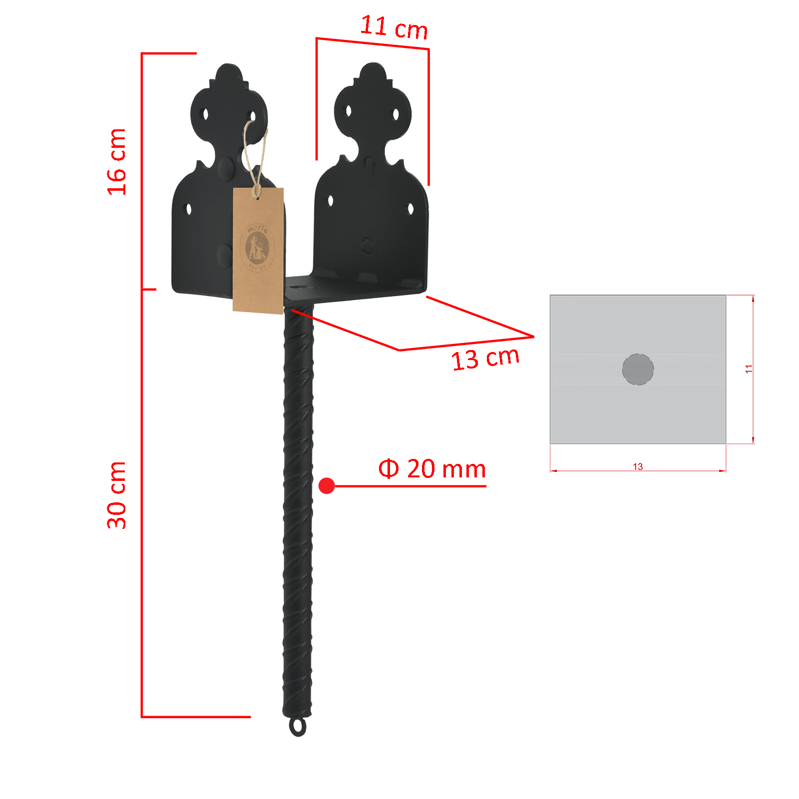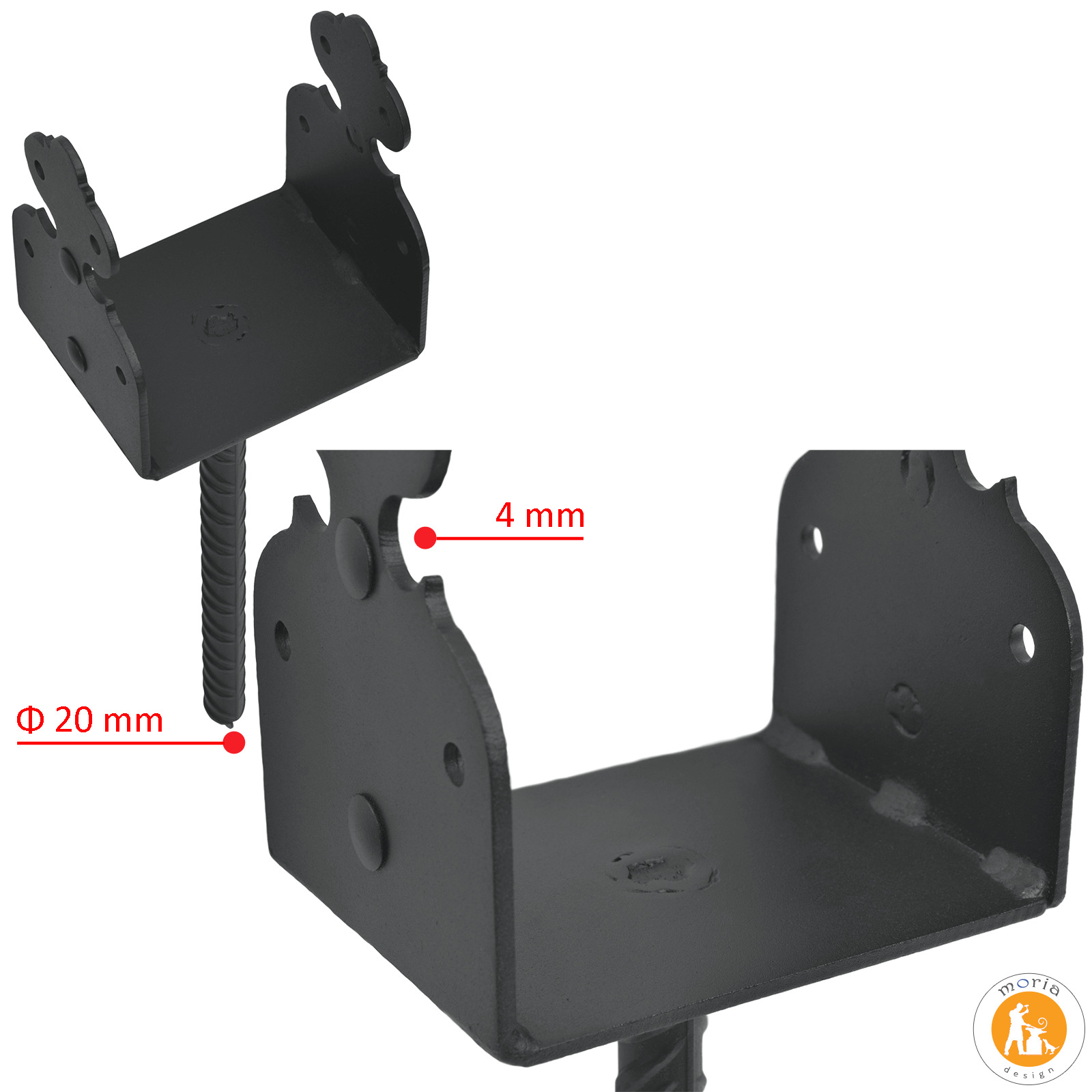 Kotew dekoracyjna M-08 od MORIA DESIGN to gwarantowany przykład solidności i przemyślanej, funkcjonalnej konstrukcji. Kotew wykonana jest ze stalowej blachy o grubości aż 4 mm oraz solidnego żebrowanego pręta o średnicy 20 mm. Miejsce styku mocowania kotwy i podłoża, to miejsce najbardziej narażone na niekorzystne działanie czynników zewnętrznych (woda po opadach atmosferycznych, psi mocz, środki chemiczne z myjek ciśnieniowych). Dlatego w naszej kotwie zastosowaliśmy pręt o grubości aż 20 mm oraz solidne zabezpieczenie antykorozyjne, które zapewni oczekiwaną odporność kotwy na niekorzystne działanie ww. czynników zewnętrznych.