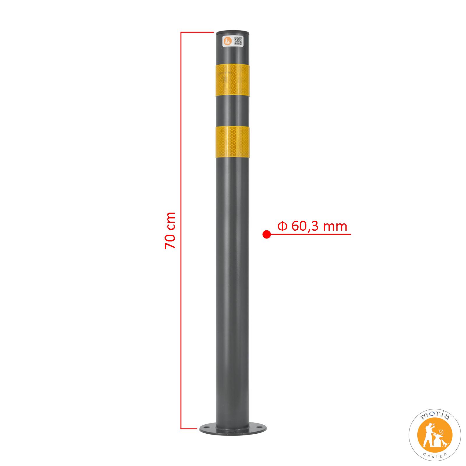 - zastosowana wysokiej jakości żółta taśma odblaskowa, górna część zakryta korkiem z tworzywa sztucznego, *ocynkowany oraz pomalowany farbą proszkową w kolorze grafitowym/antracytowym RAL 7016 – zdecydowanie wyższa odporność na uszkodzenia od powłok farb natryskowych, farby proszkowe są w pełni bezpieczne dla ludzi i środowiska > trwale i elegancko wykończony;